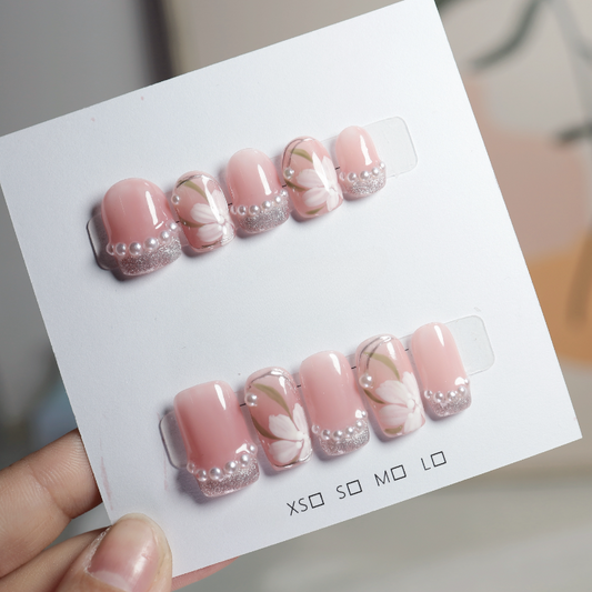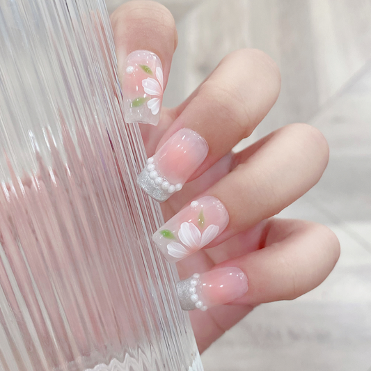 Floral Pearl Pink Medium Square Press On Nails