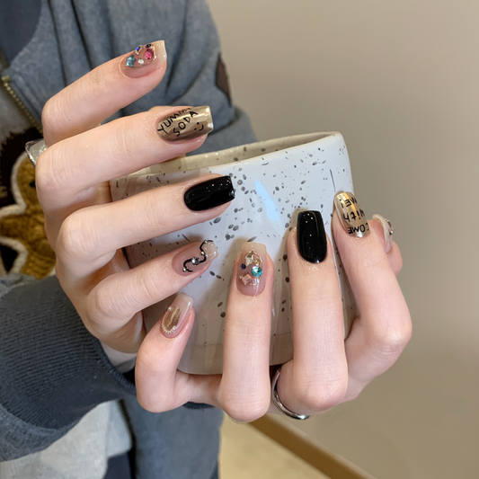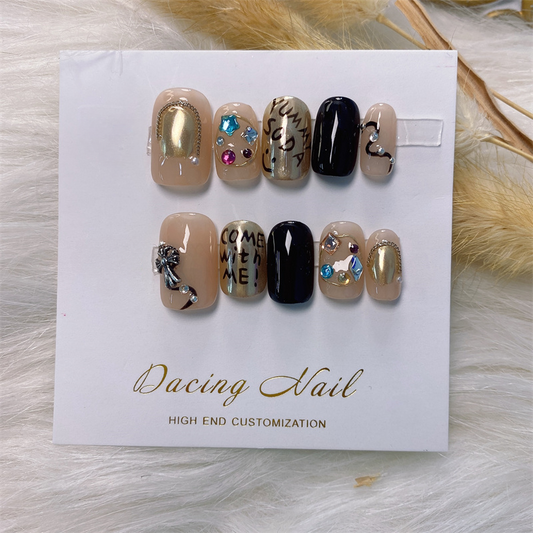Rock Style Black Gold Short Press on Nails