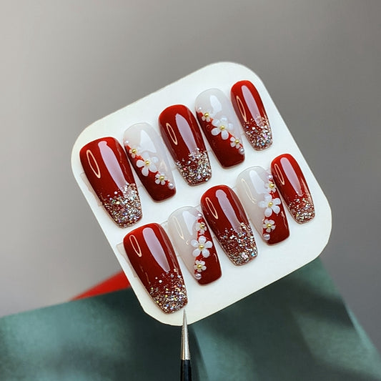 Flower Glittering Red Coffin Press On Nails Set