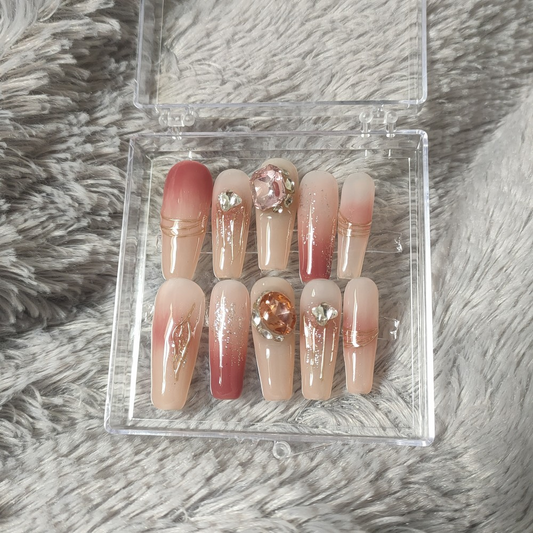 Pink Nude Press on Nails Long Coffin with Large Crystals