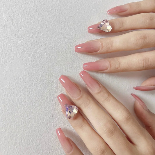 Nude Pink Big Heart Crystal Press on Nails Long Coffin