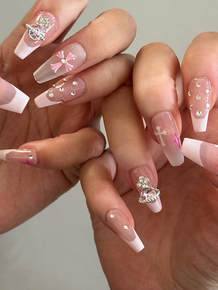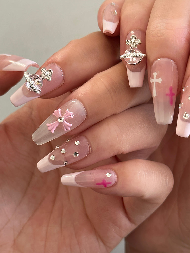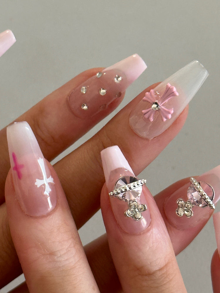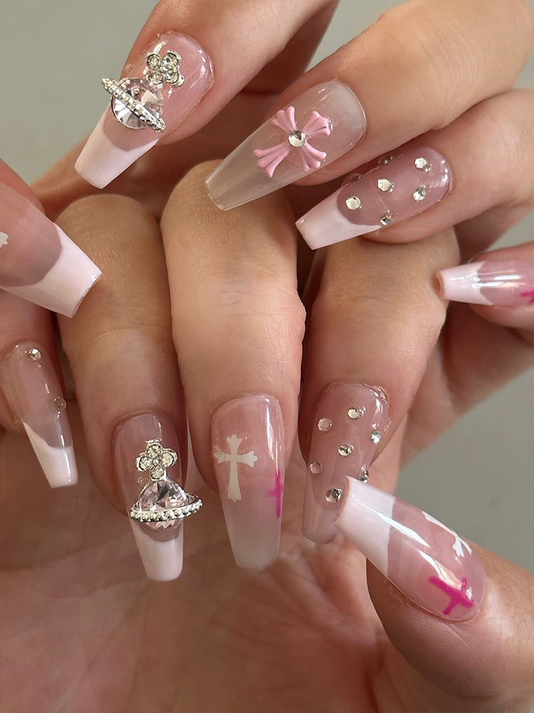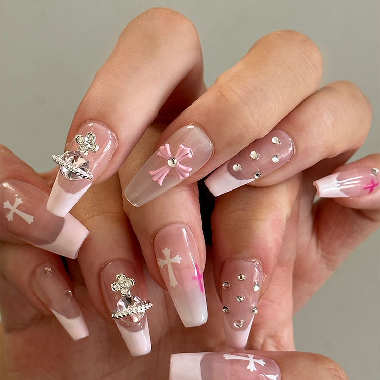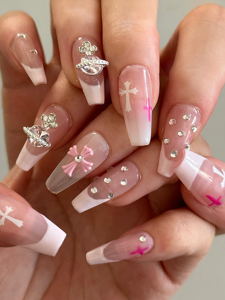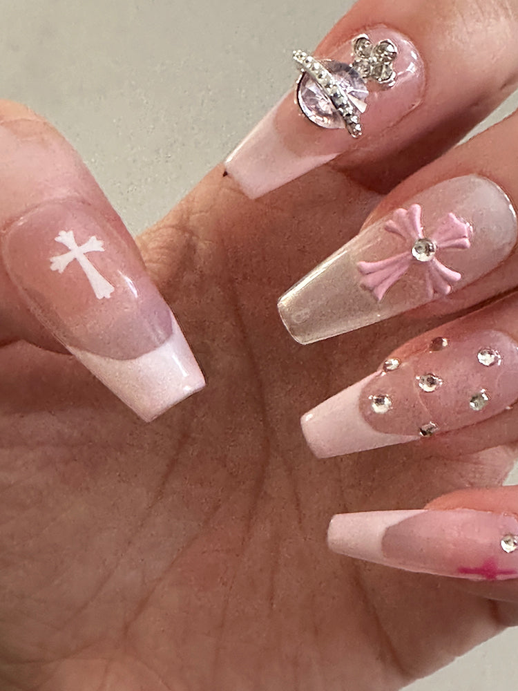 Whether you're looking for a way to add some sparkle to your everyday look or want to make a statement with your nails for a special event, our nude Y2K pink press-on nails set with crystals and cross is the perfect choice.