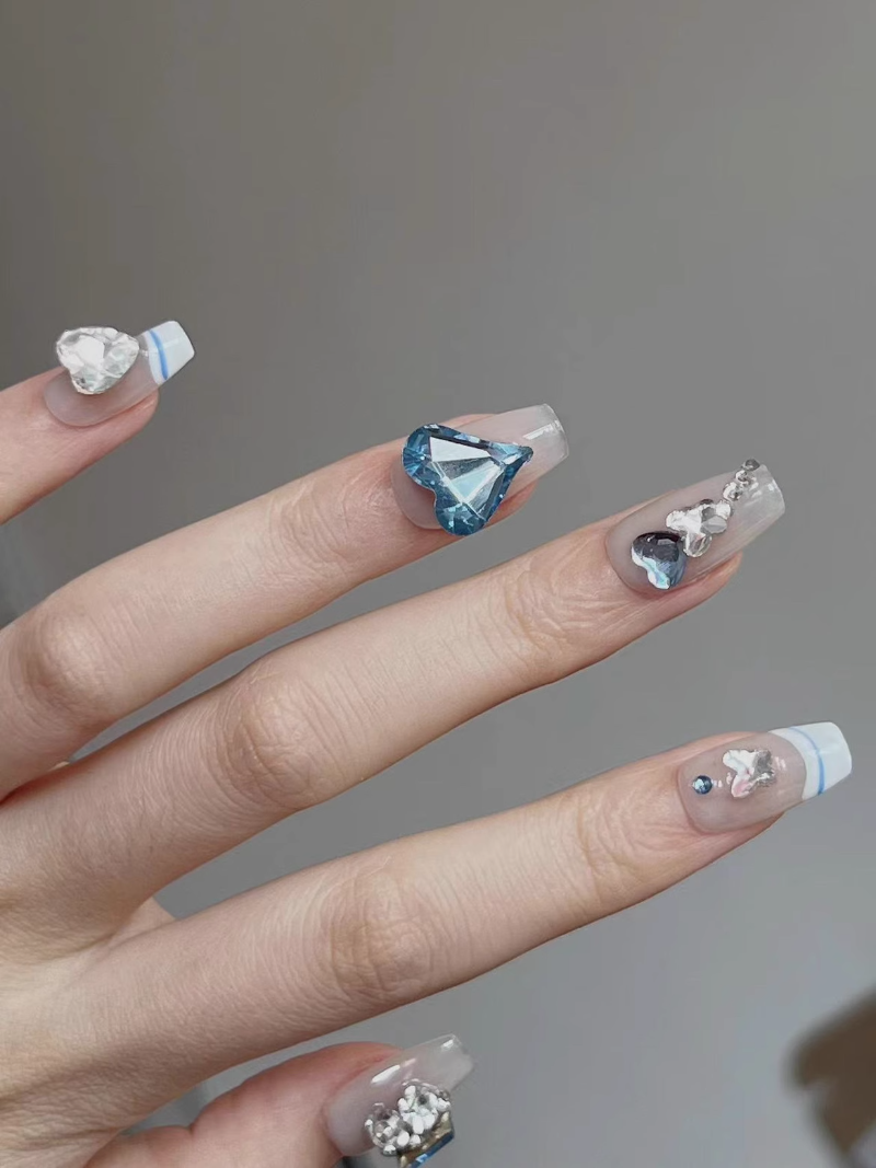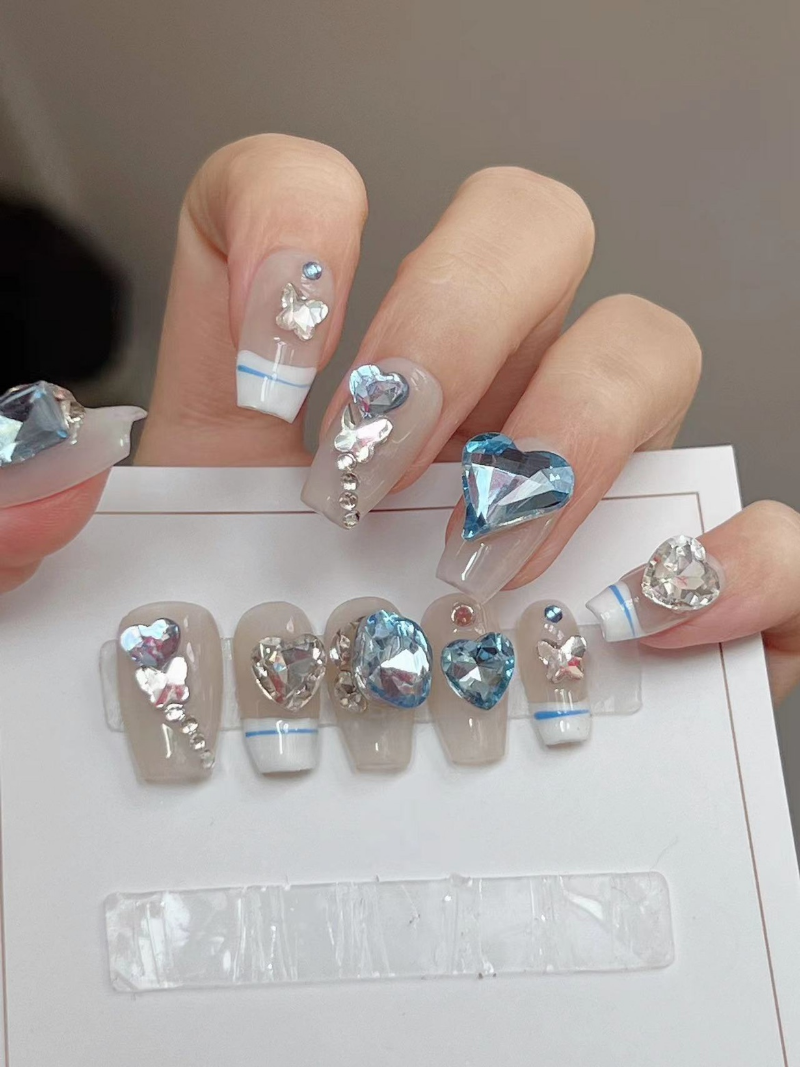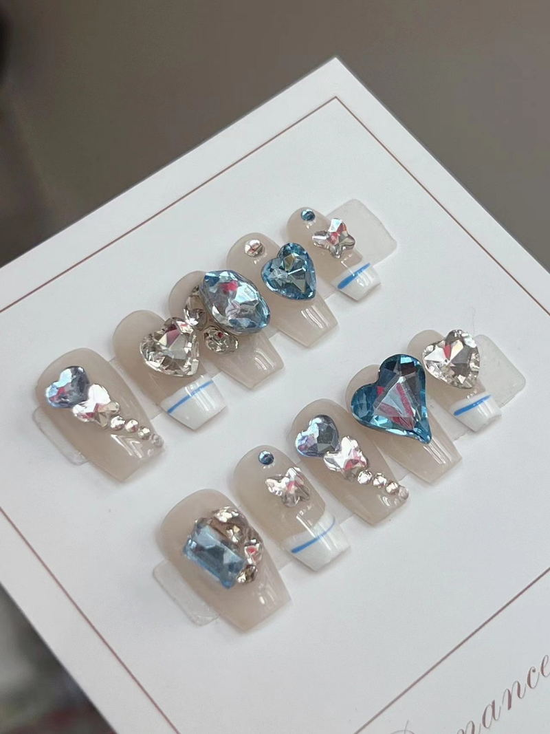 Make a statement with our stunning crystals press-on nail set, featuring a nude base with large crystals that will make your nails shine like never before.