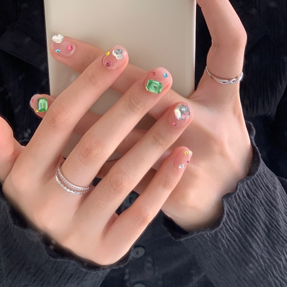 Make a statement with our stunning crystals press-on nail set, featuring a beautiful nude pink base and large, colorful crystals that will make your nails shine like never before.
