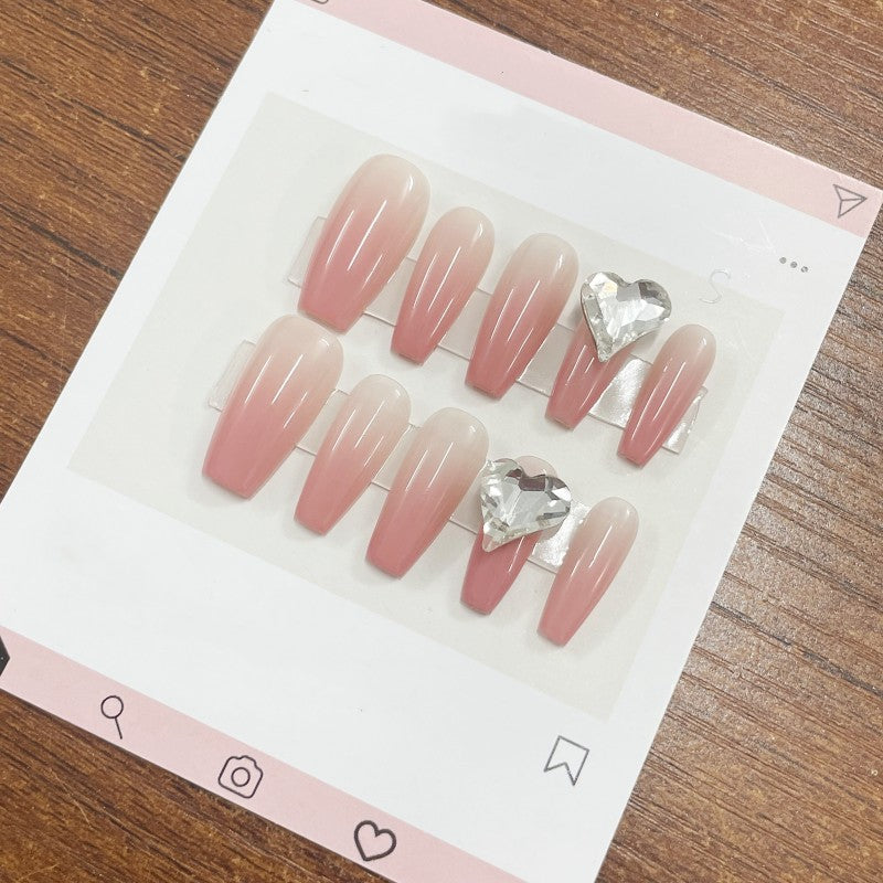 Nude Pink Big Heart Crystal Press on Nails Long Coffin